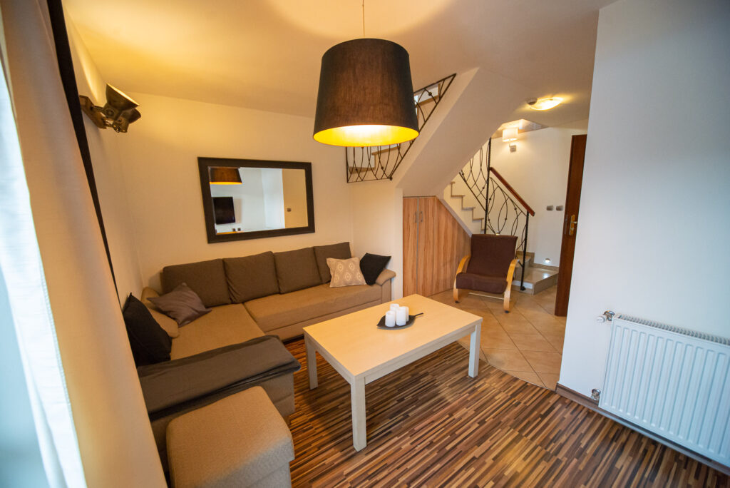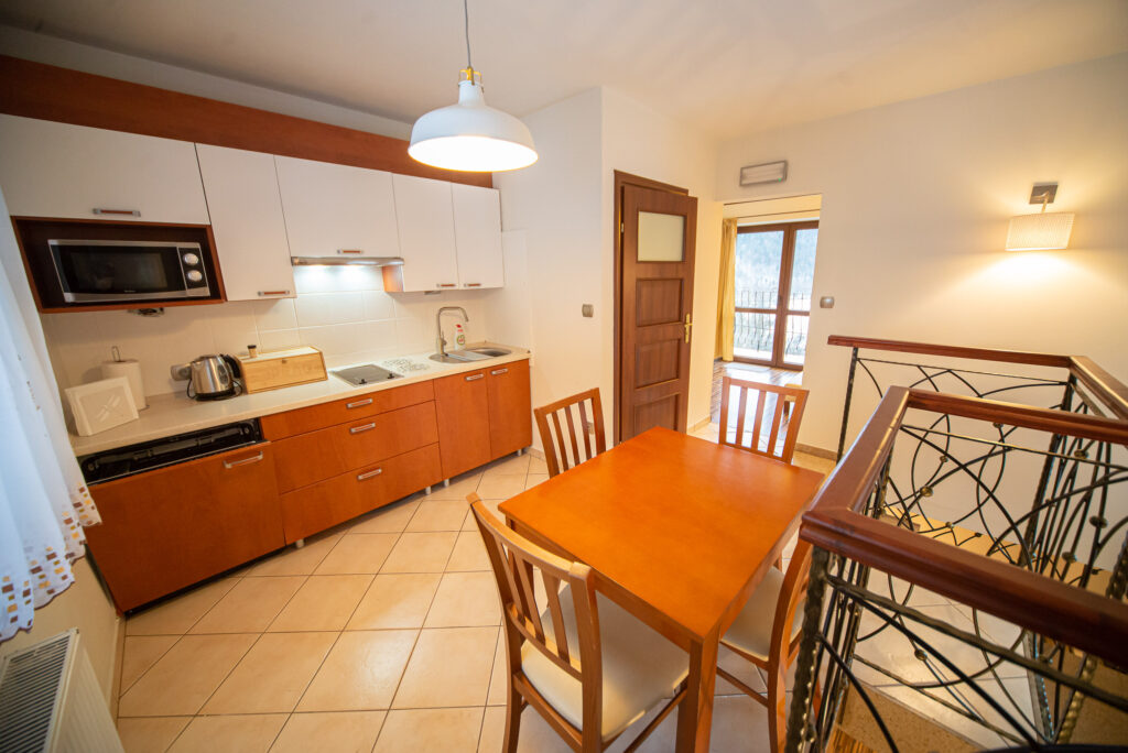 Apartamenty Nad Dunajcem składają się na dwa dwupoziomowe apartamenty(każdy 50m2). Każdy z apartamentów posiada niezależne wejście, przedpokój, salon, dużą łazienkę, kuchnię oraz sypialnię z przyległą toaletą. Mieszkania posiadają ogrzewanie podłogowe, klimatyzację, w pełni wyposażoną kuchnię(płyta elektryczna, lodówka, mikrofalówka, czajnik, naczynia, garnki, sztućce), telewizję, WIFI, odkurzacz, leżak, żelazko, deska do prasowania, suszarka do włosów, ręczniki.